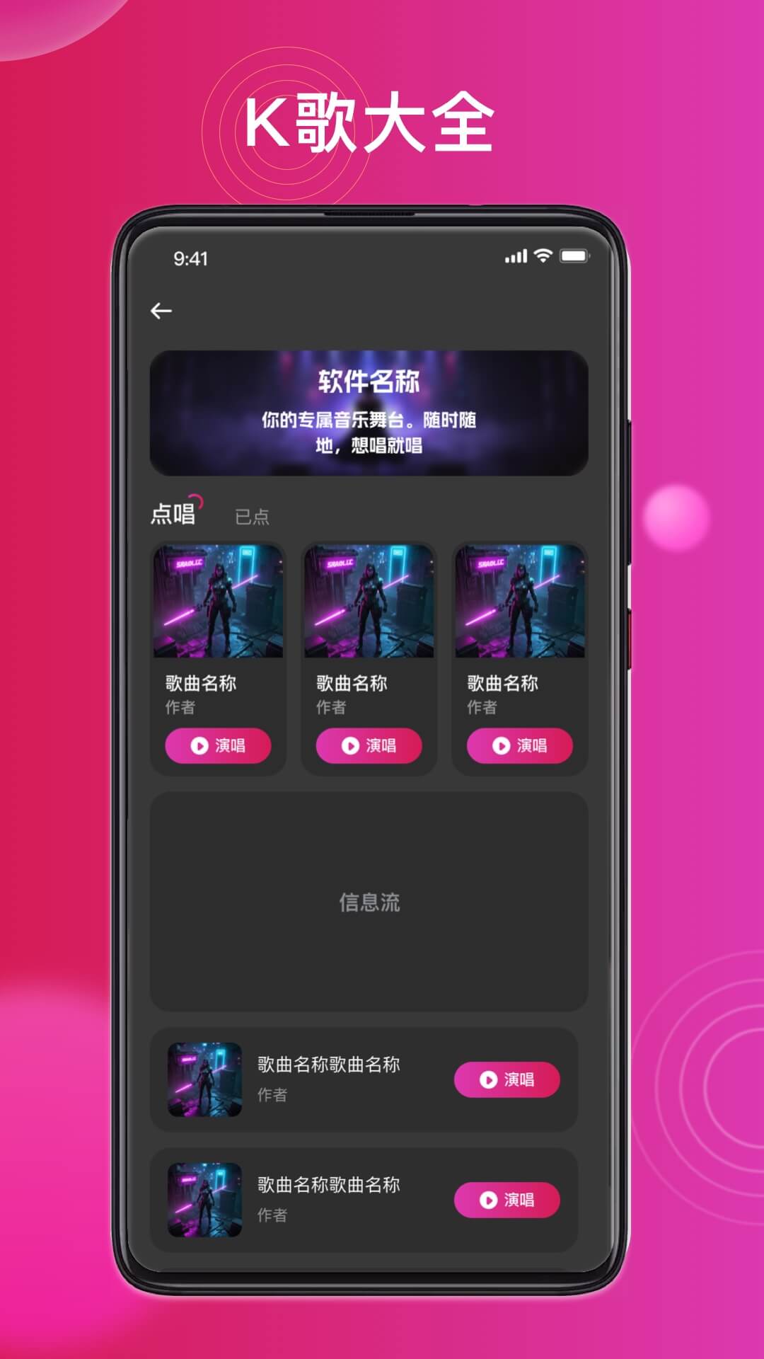 一款全民参与的唱歌互动手机K歌App。全球新歌声、好声音的汇聚地,一个纯粹的音乐平台。这里有新鲜的音乐分享、海量免费高清伴奏、KTV录音功能,任你“唱”所欲为,让全世界聆听你的声音