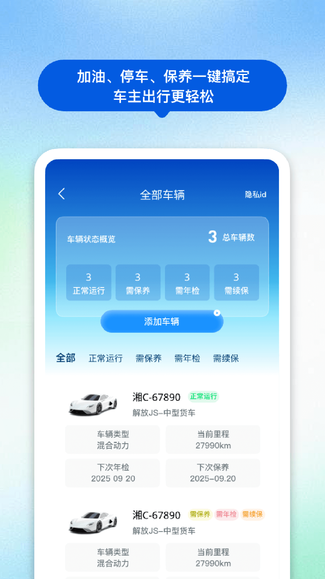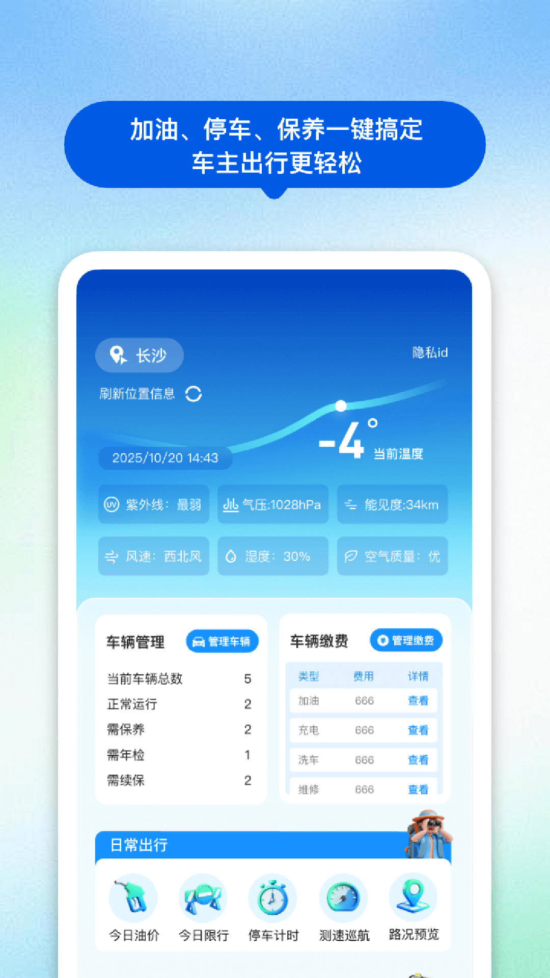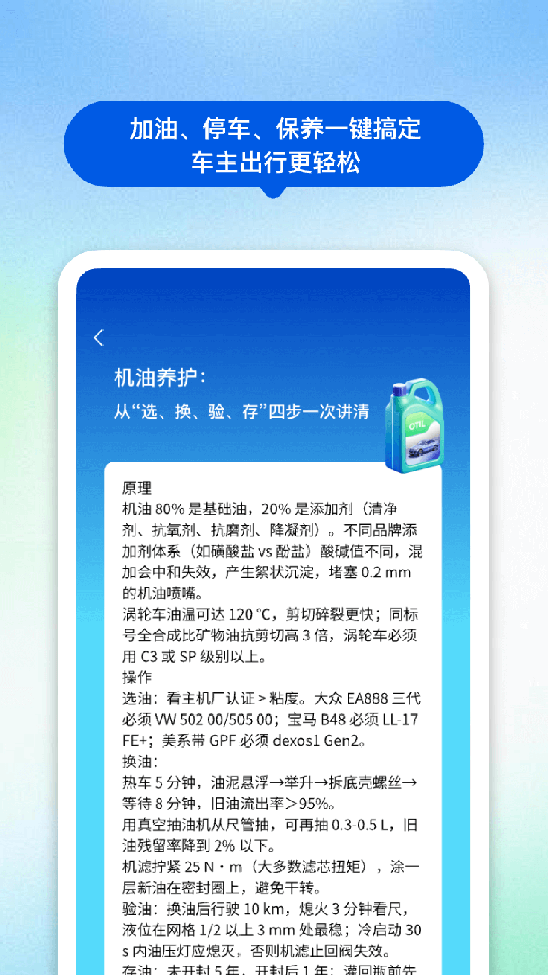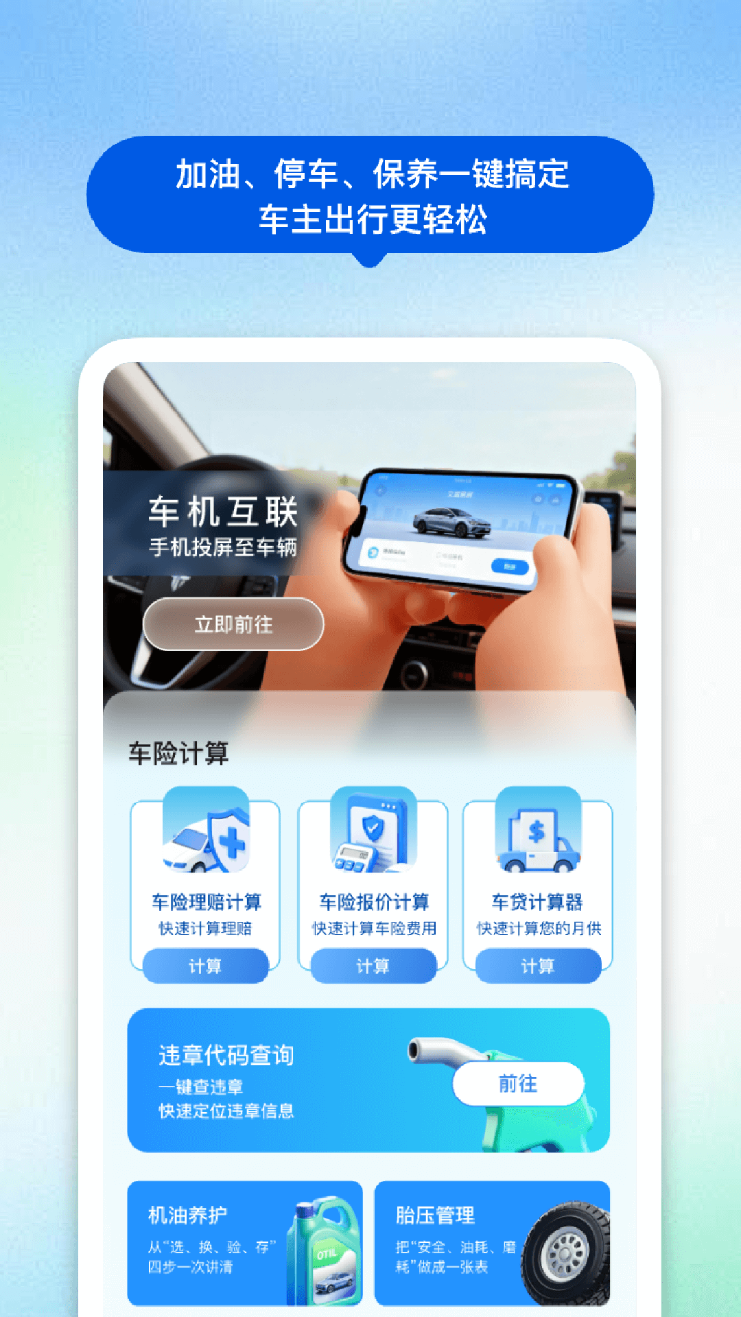 专为车主打造的“一站式出行管家”。集加油、停车、保养提醒、路况导航、违章查询、里程记账等12大核心功能于一体。内置车况档案,保养、保险、年检日期,省时省心。行车途中,导航+路况提醒;油费、过路费、停车费一目了然,帮你科学省钱。车主社区新用车干货让新手也能秒变老司机。