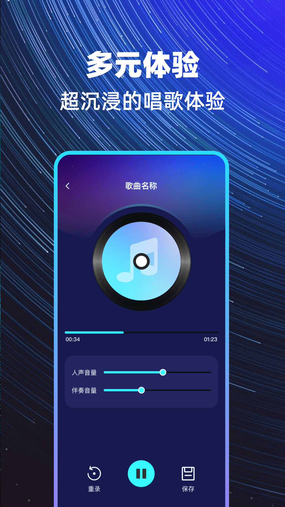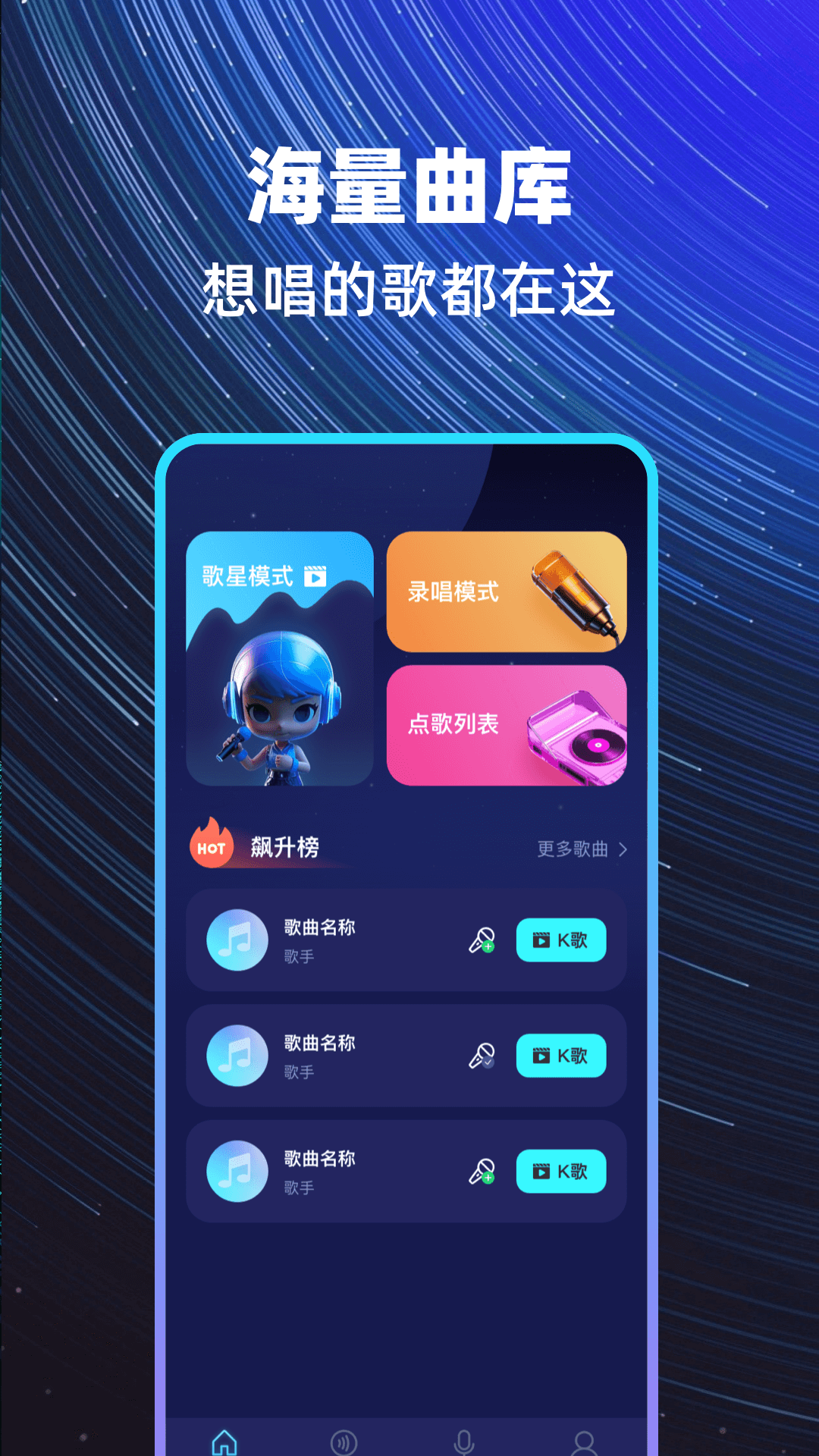 全民参与的唱歌互动手机K歌App 超多优选曲库免费点唱,智能音效优化+多维度人声调优,即刻开唱功能,支持自由嗨唱无伴奏模式,个性化音效优化。